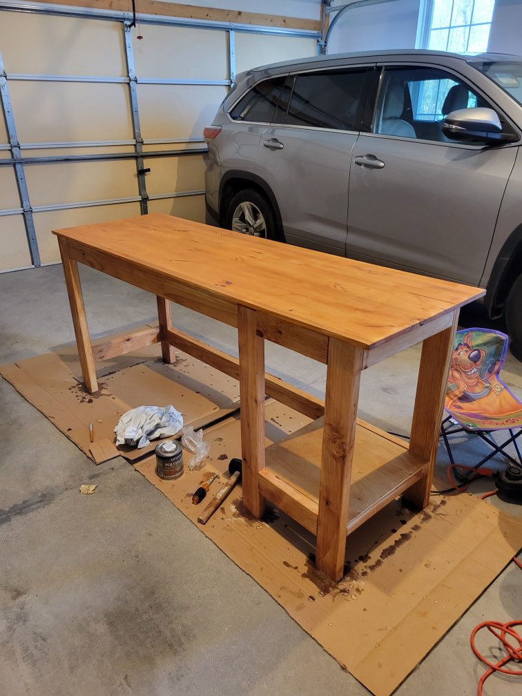 The table was my third woodworking project. The table was made using the highest quality boards we could find in lowes. The boards are 2x4s and a large table top. The table was a test project to learn how to do pocket holes. The table is almost entirely made of pocket hole screws but has 6 screws on the pc shelf.