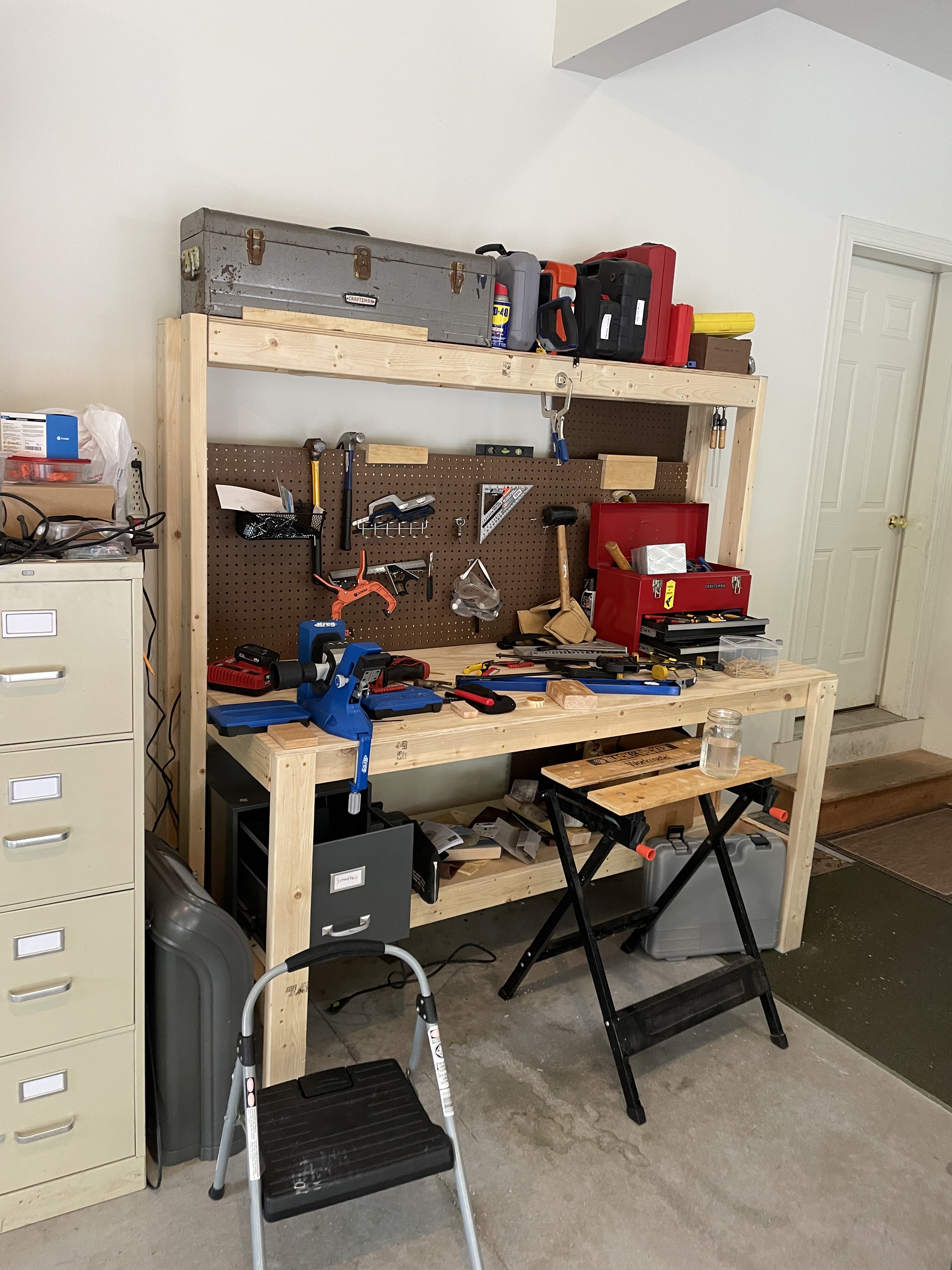 My workbench was my second project that I have made. The workbench was made using good quality boards. The boards were 2x4s and plywood. The workbench also included some peg board on the back of it. The workbench was made entirely of screws.